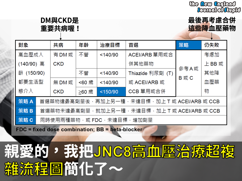 編按:去年在JAMA上刊登的報告不算是完整的JNC 8 (the Eighth Joint National Committee) 治療指引,只是因為"拖太久"了!所以有人稱為"JNC report"